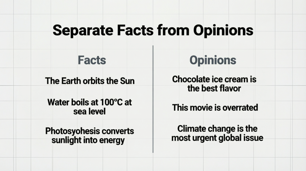 Facts are verified information. Opinions interpret those facts. Mixing them causes confusion.